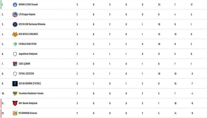 Pozostałe wyniki 3. kolejki: AZS UG Gdańsk - Wiara Lecha 3:8, Futsal Szczecin - KS Grinbud Gniezno 8:3, Toruńska Akademia Futsalu - Dragon Bojano 2:4, AZS UW Warszawa - LSSS Lębork 3:6.