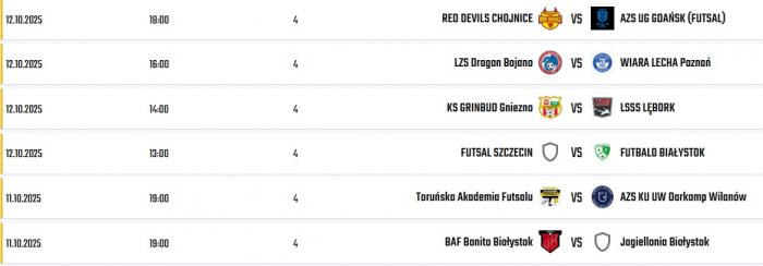 Red Devils Chojnice - BAF Bonito Białystok 7:3 (4:1). Bramki: Oleh Kryvko 1, 7, 8, Guladi Kakoladze 2, Maksym Vakushyn 22, Jefferson Moreno 39 - Krystian Rakowski 16, Bartłomiej Bukowski 22, Mikołaj Siemieniuk 22. Żółte kartki: Jefferson Moreno, Guladi Kakoladze, Pawlo Skubchenko (Red Devils), Damian Bieliński, Dominik Niemyjski, Dzmitry Stsepankou, Damian Danilewicz (BAF). Czerwona kartka: Pavlo Skubchenko (Red Devis, 26 - za 2 żółte). Sędziowali Rafał Szczypkowski, Konrad Przybysz.