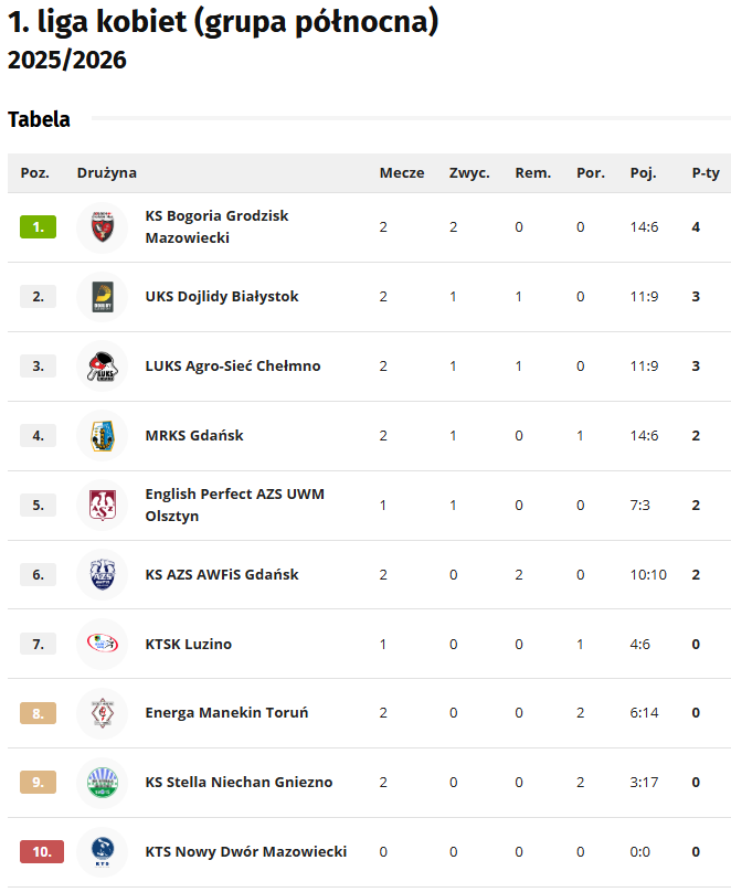 Pozostałe wyniki 2. kolejki: KS AZS AWFiS Gdańsk - LUKS Agro-Sieć Chełmno 5:5, KTSK Luzino - KS Bogoria Grodzisk Mazowiecki 4:6, KS Stella Niechan Gniezno - MRKS Gdańsk 0:10. Mecz KTS Nowy Dwór Mazowiecki - English Perfect AZS UWM Olsztyn - przełożony 26.10