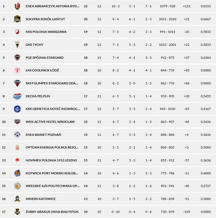 Wyniki 12. kolejki: Enea Basket Poznań - Enea Abramczyk Astoria Bydgoszcz 102:97, Polonia Warszawa - KSK Quemetica Noteć Inowrocław 79:88, GKS Tychy - PGE Spójnia Stargard 65:79.