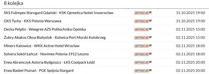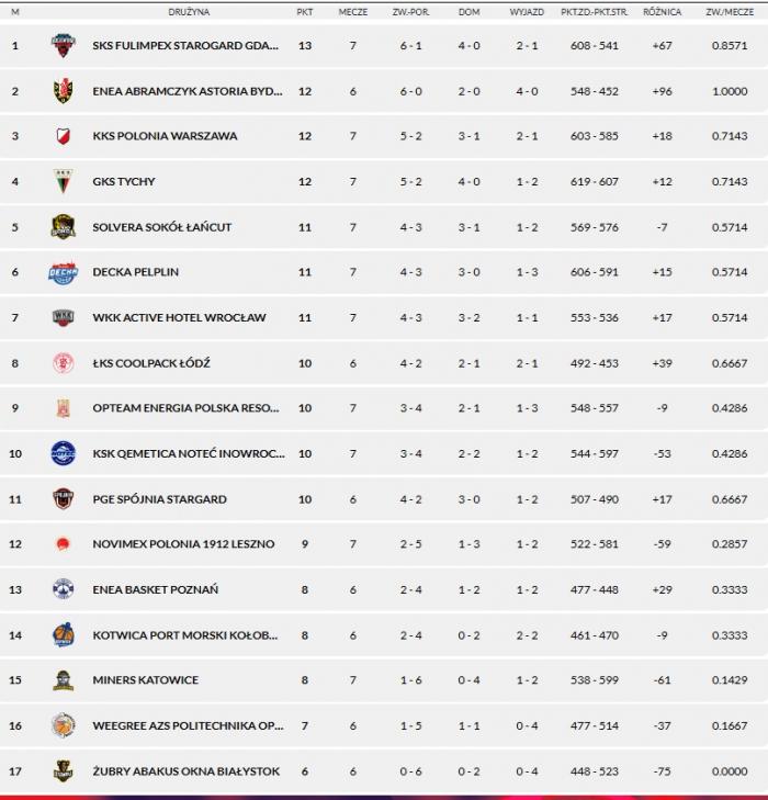 Pozostałe wyniki 7. kolejki: Noteć Inowrocław - Miners Katowice 82:79, WKK Wrocław - Energa Polska Resovia Rzeszów 76:69, Kotwica Port Morski Kołobrzeg - Astoria Bydgoszcz 89:91, Sokół Łańcut - Decka Pelplin 77:70, Polonia 1912 Leszno - GKS Tychy 88:67, Polonia Warszawa - SKS Fulimpex Starogard Gdański 86:77, ŁKS Coolpack Łódź - Weegree AZS Politechnika Opolska 81:80.