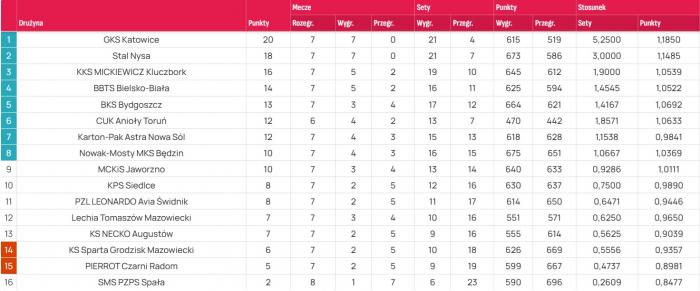 Pozostałe wyniki 7 kolejki: KPS Siedlce - Nowak-Mosty MKS Będzin 2:3, BBTS Bielsko-Biała - SMS PZPS Spała 3:0, KKS Mickiewicz Kluczbork - Pierrot Czarni Radom 3:0, Lechia Tomaszów Mazowiecki - GKS Katowice 0:3, PZS Leonardo Avia Świdnik - Karton-Pak Astra Nowa Sól 0:3, Sparta Grodzisk Mazowiecki - Stal Nysa 2:3, SMS PZPS Spała - Karton PAK Astra Nowa Sól 0:3. Mecz CUK Anioły - BKS Bydgoszcz - 31 października.