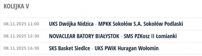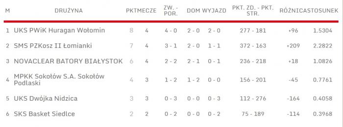Pozostałe wyniki 4 kolejki: UKS PWiK Huragan Wołomin - UKS Dwójka Nidzica 86:37, MPKK Sokołów S.A Sokołów Podlaski - SMS PZKosz II Łomianki 38:91.
