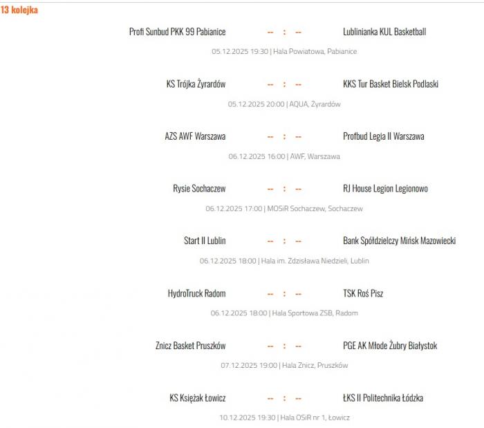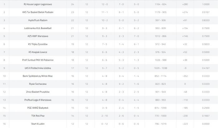 Pozostałe wyniki 12. kolejki: Profbud Legia II Warszawa - Księżak Łowicz 72:83, ŁKS II Politechnika Łódzka - Start II Lublin 85:67, TSK Roś Pisz - KS Trójka Żyrardów 66:101, Profi Sunbud PKK 99 Pabianice - Rysie Sochaczew 101:73, Bank Spółdzielczy Mińsk Mazowiecki - Lublinianka KUL Basketball 67:96, RJ House Legion Legionowo - HydroTruck Radom 79:59.