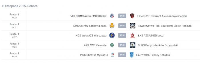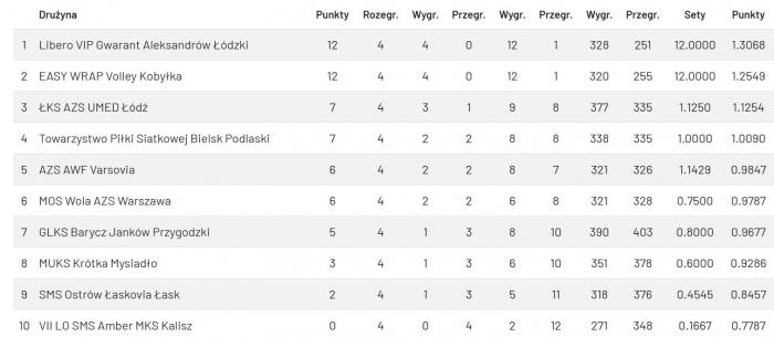 Pozostałe wyniki: Libero VIP Gwarant Aleksandrów Łódzki - MOS Wola AZS Warszawa 3:0, GLKS Barycz Janków Przygodzki - VII LO SMS Amber MKS Kalisz 3:1, EASY WRAP Vollej Kobyłka - AZS AWF Varsovia 3:1, ŁKS AZS UMED Łódź - SMS Ostrów Łaskovia Łask 3:0.