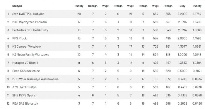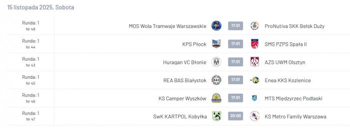 Pozostałe wyniki: Huragan VC Błonie - Enea KKS Kozienice 3:0, Enea KKS Kozienice - KPS Płock 1:3, MTS Międzyrzec Podlaski - REA BAS Białystok 3:0, ProNutive SKK Belsk Duży - SwK KARTPOL Kobyłka 1:3, KS Metro Family Warszawa - KS Camper Wyszków 3:2, MOS Wola Tramwaje Warszawskie - Huragan VC Błonie 0:3, SMS PZPS Spała II - AZS UWM Olsztyn 3:1.