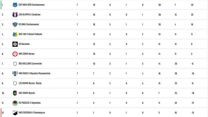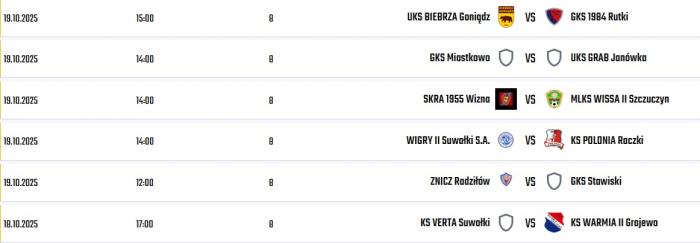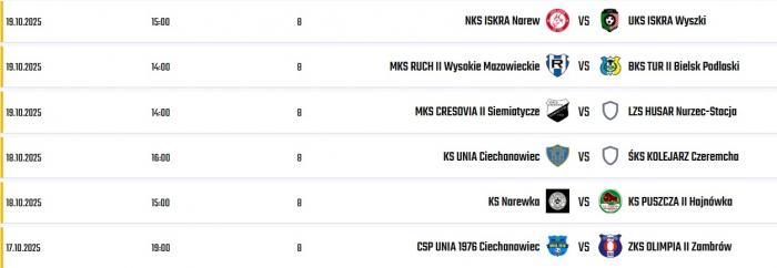 Puszcza II Hajnówka - Ruch II Wysokie Mazowieckie 2:4 (0:1). Bramki: Maciej Czarnota 90, Oskar Tellos 90+3 - Jakub Żero 8, Asrorbek Khasanboev 5, Mikołaj Grodzki 62, Jakub Żero 66-karny. Żółte kartki: Bartosz Ostapczuk (Puszcza II), Mikołaj Grodzki (Ruch II). Sędziował: Adam Perkowski.