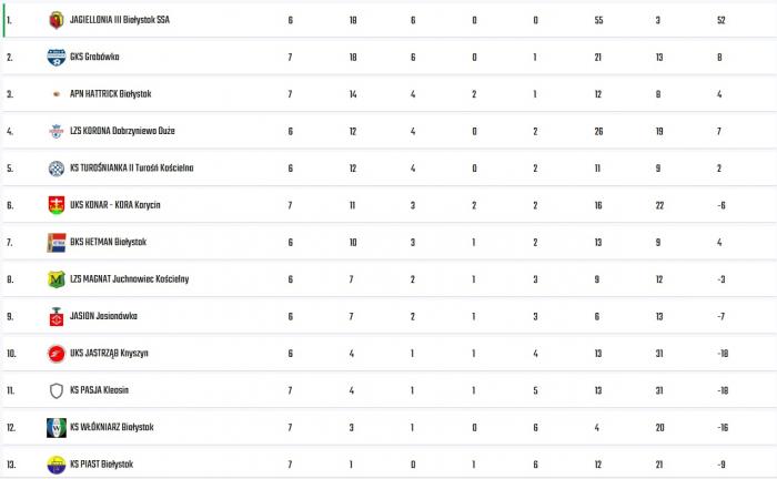 Trzeci zespół Jagiellonii pewnie przewodzi stawce w grupie 2. Żółto-czerwona młodzież wygrała pewnie ekipę Hattrick Białystok 4:0 zaliczając szóstą wygraną z rzędu w tym sezonie. Dobrze poradziła sobie też GKS Grabówka, która bardzo wysoko pokonała w Knyszynie Jastrząb. Do przerwy na boisku był remis, ale II połowa należała do graczy GKS-u.