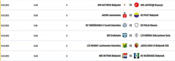 Pasja Kleosin - Magnat Juchnowiec 3:4 (0:3). Bramki: Bartosz Dekarz 49, Kamil Lewoc 55, Damian Wasiluk 58 - Kacper Mojsak 9, 21, 88, Jakub Wolny 43. Żółte kartki: Bartosz Dekarz, Miłosz Rutkowski (Pasja), Kacper Mojsak (Magnat). Sędziował: Piotr Ukalski.