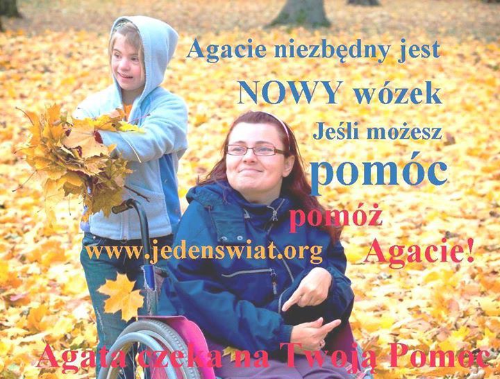 Agata czeka na nowy wózek. Sprawa naprawdę pilna, bo nowy, większy wózek jest bardzo potrzebny nie tylko osobie niepełnosprawnej, ale na dodatek wolontariuszce w jednej osobie. Może znasz kogoś, komu wózek jest już niepotrzebny. Może wiesz, kto może taki wózek Agacie podarować?