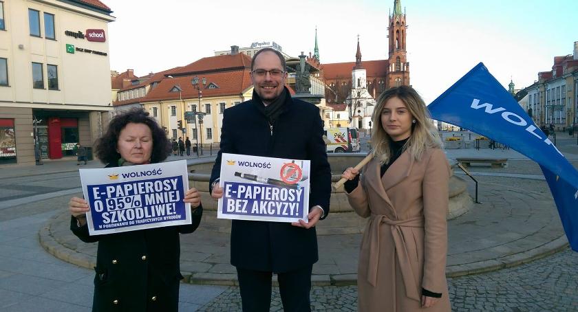 "Pieniądze to nie wszystko" - pod takim hasłem trwa ogólnopolska kampania Wolności. Jak tłumaczy Marcin Sawicki (na zdj.), wiceprezes tej partii w Podlaskiem, PiS złożyło propozycję, aby objąć akcyzą e-papierosy. Przekonuje przy tym, że jeżeli tak się stanie, ceny pójdą drastycznie w górę. Sawicki podaje przykłady: liquidy podrożeją o 60 proc. - z 11 na 17 zł, a bazy nikotynowe o 300 proc. - z 3 na 9 zł.