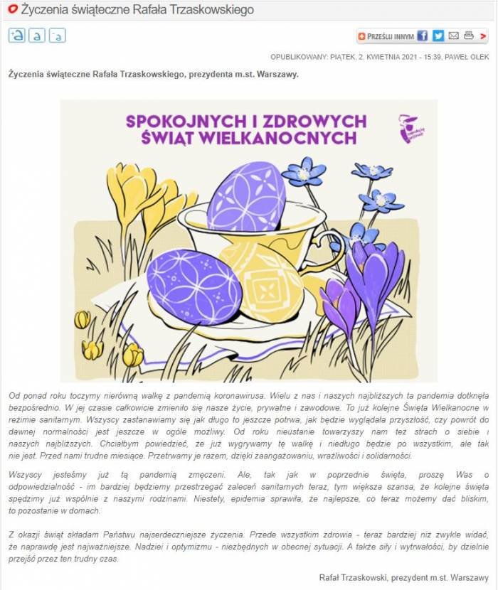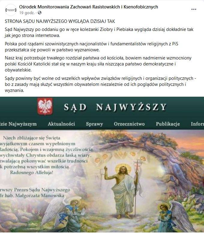 Tu sensu po prostu nie ma. Ale wpis zamieszczony na Facebooku i Twitterze przez Ośrodek Monitorowania Zachowań Rasistowskich i Ksenofobicznych jest nie tyle skandaliczny, co po prostu bezdennie głupi. Pojawiła się krytyka, wręcz można powiedzieć – krytyka przesiąknięta nienawiścią – i tylko za to, że na stronie Sądu Najwyższego, prezes tego Sądu złożyła życzenia świąteczne z okazji Świąt Wielkanocnych.