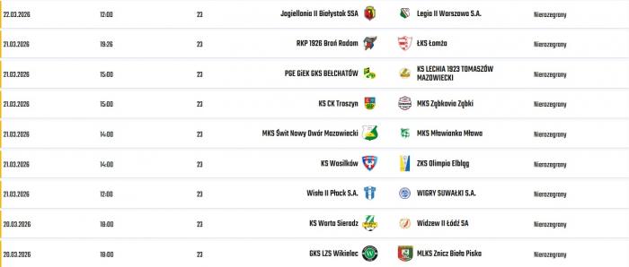 Wigry Suwałki - Znicz Biała Piska 7:0 (3:0) Bramki: Kacper Głowicki 6 54, Michał Ozga 21, Jakub Fronczak 35 , Bartosz Gużewski 62,Jakub Kwiatkowski 78, Bartosz Guzdek 90+2. Żółte kartki: Kasjan Klebus (Znicz), Pavlo Berezianskyi (Wigry). Sędziował: Kamil Chmielewski