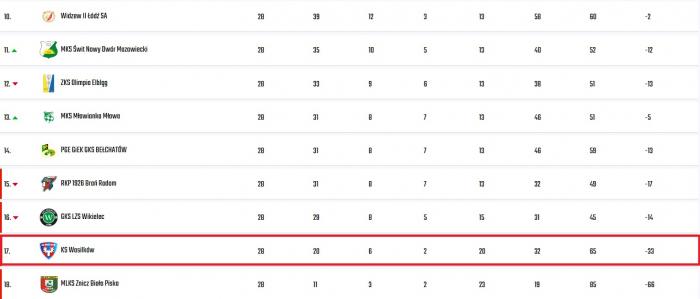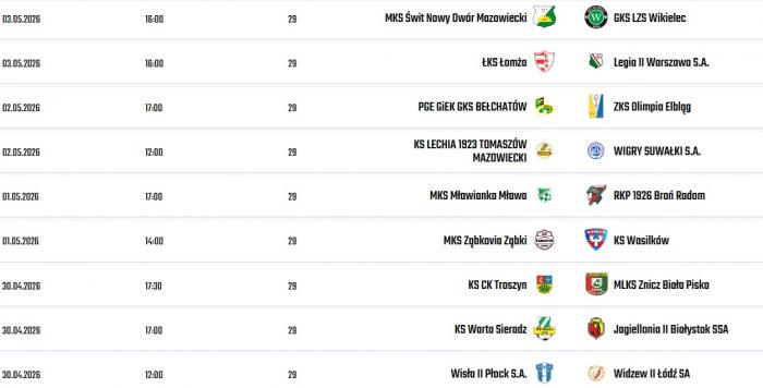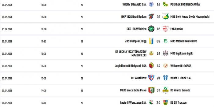 KS Wasilków - Wisła II Płock 2:1 (0:0). Bramki: Damian Wysocki 83-karny, Cezary Kuprianowicz 90+3 - Oskar Dari 53. Żółte kartki: Bartosz Bayer, Jakub Borys, Tomasz Porębski (Wasilków), Jakub Głaz, Antoni Chmielewski, Oliwier Szcześniak, Szymon Leśniewski (WIsła II). Sędziował: Łukasz Dobrzyński.