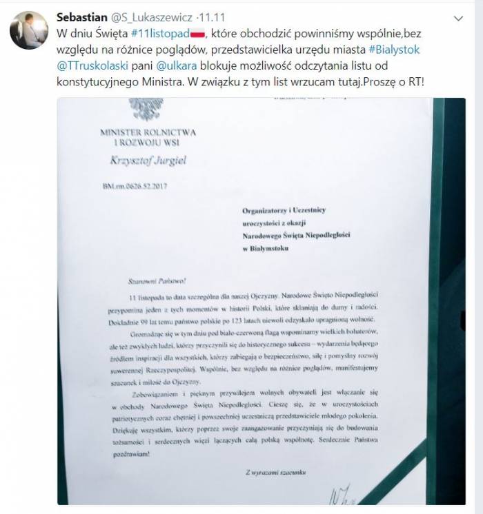 „W dniu Święta #11listopad, które obchodzić powinniśmy wspólnie, bez względu na różnice poglądów, przedstawicielka urzędu miasta #Bialystok @TTruskolaski pani @ulkara blokuje możliwość odczytania listu od konstytucyjnego Ministra. W związku z tym list wrzucam tutaj. Proszę o RT!” – brzmi wpis na twitterze Sebastiana Łukaszewicza.