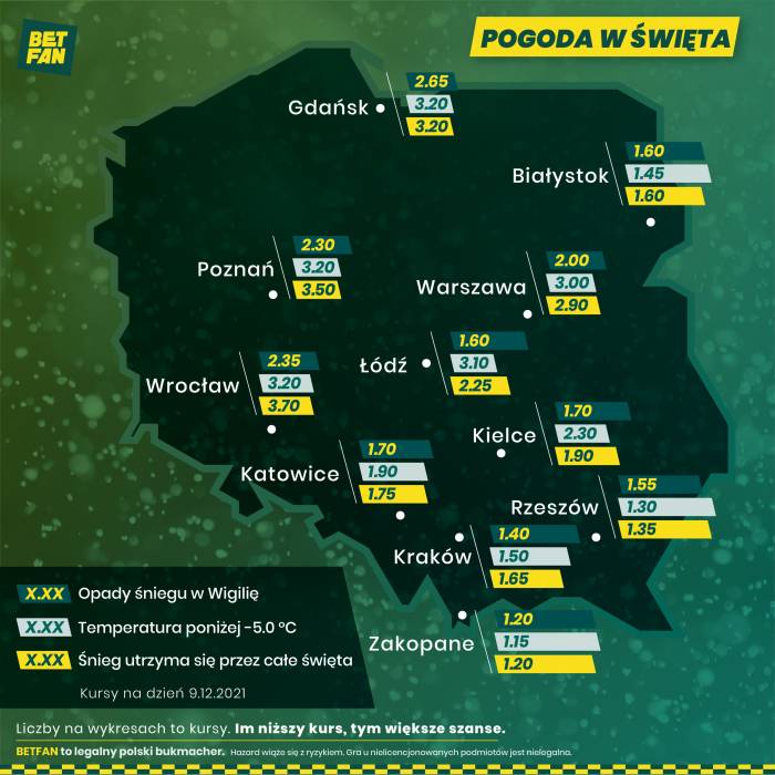 Śnieżnie będzie też w Małopolsce i na Podhalu. Zdaniem BETFAN w Zakopanem będzie padał śnieg w Wigilię, który utrzyma się także przez całe święta. Termometry w świąteczne dni pokażą tam poniżej -5 st. C. Wedle bukmachera śnieg w Wigilię będzie padał także w Krakowie, Rzeszowie, Łodzi i Kielcach. Spośród tych miast, oprócz Białegostoku, jedynie Rzeszów, Zakopane i Kraków mają największą szansę, aby pokrywa śniegowa utrzymała się do 26 grudnia.