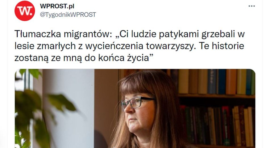 Rozgłosu stacji TVN najwyraźniej pozazdrościł tygodnik Wprost, ponieważ w sieci pojawiła się następna kompletnie niewiarygodna historia. W materiale zamieszczonym na łamach tygodnika wypowiedziała się bowiem tłumaczka, która była wzywana do czynności prawno – administracyjnych z nielegalnymi migrantami. I tam najwyraźniej miała usłyszeć historię o tym, jak migranci „patykami grzebali w lesie zmarłych z wycieńczenia towarzyszy”.