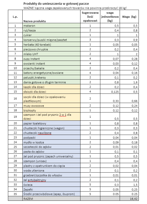 Caritas opracowała listę produktów, według której należy przygotować paczkę. Są na niej głównie artykuły spożywcze o długim terminie przydatności do spożycia, a także artykuły higieniczne (dokładna lista poniżej). Przygotowanie paczki według wskazówek dotyczących liczby i rodzaju opakowań konkretnych produktów pozwoli na zapewnienie podstawowego zaopatrzenia dla kilkuosobowej rodziny na tydzień. Uwaga: paczka nie może być zaklejona – zamknie ją, po sprawdzeniu zawartości, pracownik lub wolontariusz Caritas.