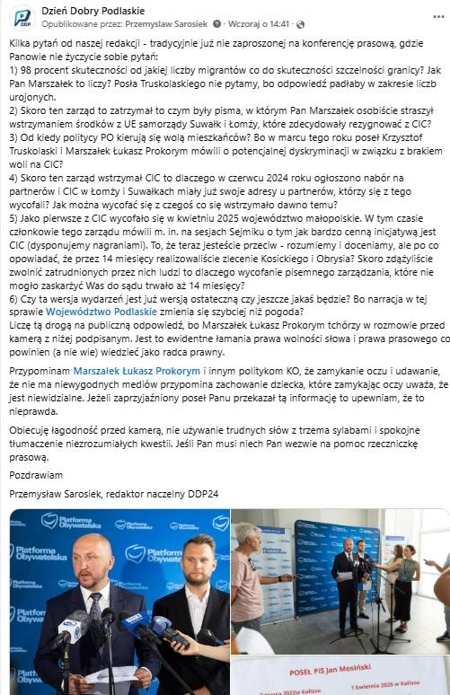 - Fakt nr 6. Kolejne sejmiki w kwietniu, maju i czerwcu 2025 to spory radnych PiS gardłujących przeciw CIC-om, paktowi migracyjnemu itp. Radni rządzącej koalicji (PO-PSL-Polska 2050 i dwójka byłych radnych PiS) protestują. Odpowiadają historie, że Polacy też byli migrantami w latach 80-tych i 90-tych ubiegłego wieku. Mówią o tym jak wielką pomocą mogą być cudzoziemcy w walce ze zjawiskiem braku rąk do pracy i depopulacją województwa. W tym samym okresie Rada Miasta Białegostoku głosami PO dwukrotnie odrzuca propozycje uchwalenia stanowisk przeciw powstawaniu CIC w Białymstoku i migrantom przysyłanym w ramach Paktu Migracyjnego. W zasadzie robi to bez dyskusji i prób poprawek do uchwały.