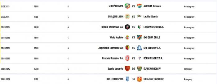 Pozostałe wyniki 2. kolejki: Miedź Legnica - Śląsk Wrocław 3:2, Polonia Warszawa - Górnik Zabrze 2:3, Wisła Kraków - Stal Rzeszów 2:1, Odra Opole - Znicz Pruszków 2:0, Lech Poznań - Legia Warszawa 3:1, Escola Varsovia - Lechia Gdańsk 3:3, Resovia Rzeszów - Zagłębie Lubin 0:1.