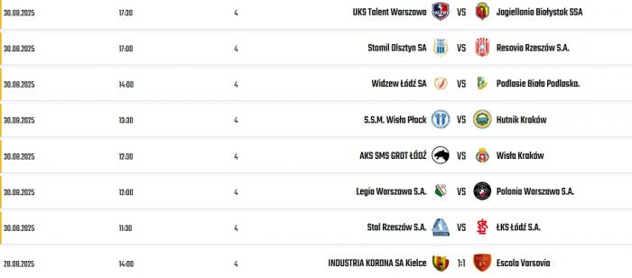 Pozostałe wyniki 1. kolejki: Widzew Łódź - Wisła Płock 4:0, Torpeda Mokotów - ŁKS Łódź 5:1, Radomiak Radom - Varsovia Warszawa 0:4, AKS SMS GROT Łódź - Polonia Warszawa 1:2, Znicz Pruszków - Legia Warszawa 0:7.