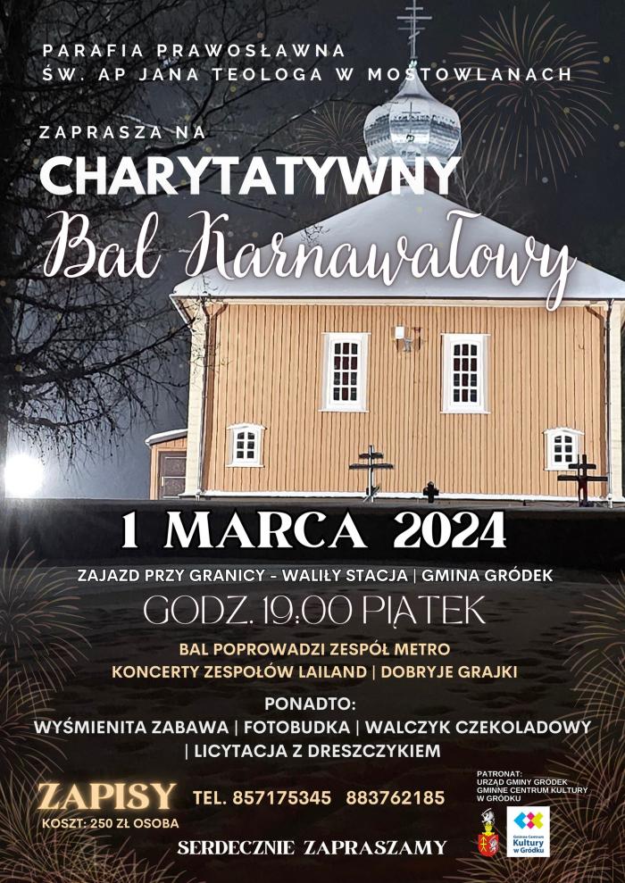 Chcielibyśmy Was zaprosić na pierwszy w historii Charytatywny Bal Karnawałowy na rzecz naszej parafii, który odbędzie się w restauracji „Zajazd przy Granicy” (Pronar) w Waliłach-Stacji (gm. Gródek) już 1 marca o godz. 19.00.