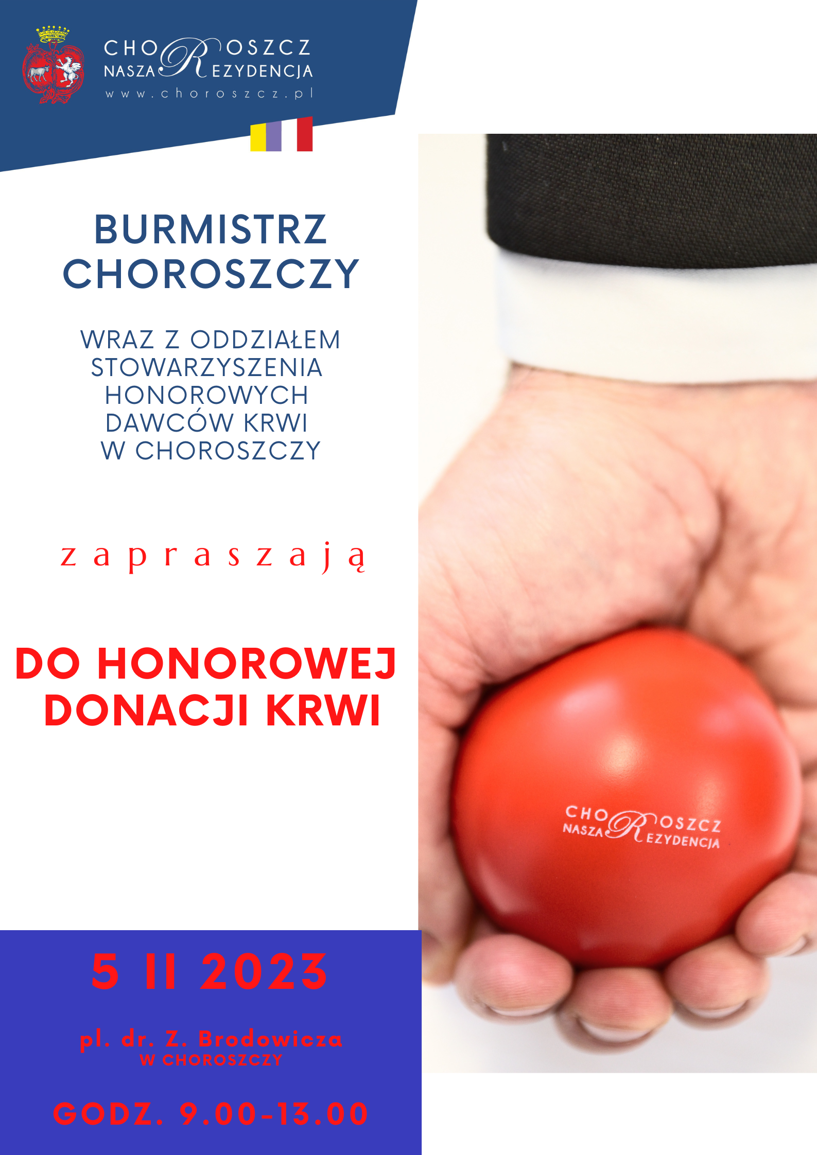 Burmistrz Choroszczy wraz ze Stowarzyszeniem Honorowych Dawców Krwi, Oddziałem w Choroszczy zapraszają, by w niedzielę 5 lutego br. w godzinach 9.00-13.00 w ambulansie na Placu dr. Zygmunta Brodowicza w Choroszczy honorowo oddać krew.