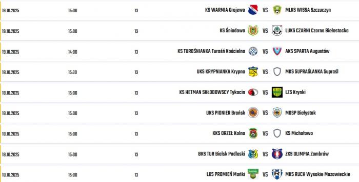 A dla kogo będzie pechowa - trzynasta - kolejka? Najciekawszym meczem zapowiadają się derby powiatu grajewskiego. W niedzielę o 15.00 w Grajewie Wilczki podejmą u siebie Wissę Szczuczyn. Będzie to nie tylko gra dwóch ekip, które ostatnio pogubiły punkty ale także mecz derbowy, a takie konfrontacje zawsze budzą ogromne emocje. Ciekawy będzie też sprawdzian formy Ruchu Wysokie Mazowieckie w konfrontacji z Promieniem Mońki (sobota, godz. 15.00), a w Bielsku Podlaskim Tura czeka walka z Olimpią Zambrów (sobota, godz. 15.00).