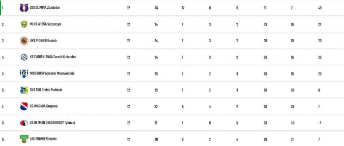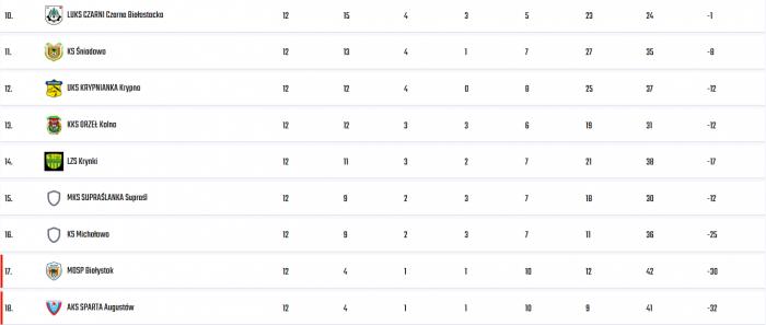 A co się dzieje w dole tabeli: Sparta Augustów odstaje coraz bardziej od reszty stawki (AKS przegrał po walce z Turem) wraz z towarzyszem niedoli czyli MOSP Białystok (też 0:2 ale z Hetmanem). 5 oczek więcej niż para outsiderów mają Michałowo (porażka u siebie z Brańskiem) i Supraślanka Supraśl (wtopa 0:1 u siebie ze Śniadowem). Nie wiedzie się też Krynkom, które zamiast wykorzystać atut własnego boiska w grze z Krypnianką przegrała u siebie 1:4.