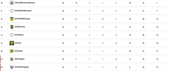 Dwie rozegrane kolejki nie dokonały trzęsienia ziemi w czwartoligowej tabeli. Walec z Zambrowa dalej rozjeżdża rywali jadąc ku III lidze. Grajewska Warmia gubi punkty remisując mimo przewagi, a Wissa Szczuczyn po zdobyciu twierdzy Brańsk nieoczekiwanie zgubiła punkty w Kolnie. Na przeciwnym biegunie tabeli pogarsza się pozycja augustowskiej Sparty. Kilka spotkań między ekipami broniącymi się przed spadkiem zakończyło się podziałem punktów.