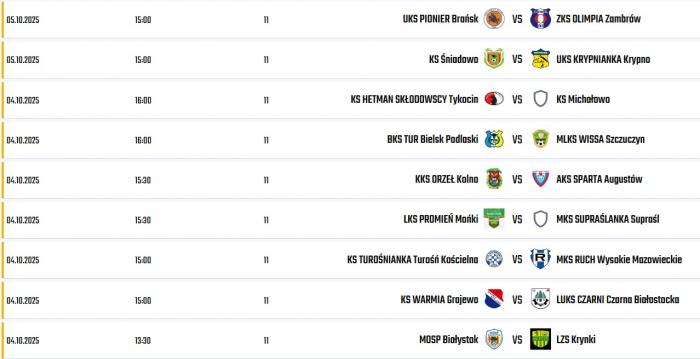Sparta Augustów - Pionier Brańsk 0:6 (0:1). Bramki: Mateusz Jambrzycki 3, 57, 86, Eryk Kajewski 62, Tymoteusz Kulik 71, 78. Żółta kartka: Błażej Fuks (Sparta). Czerwona kartka: Fedir Maslov (Sparta, 66). Sędziował: Arkadiusz Brysiewicz.