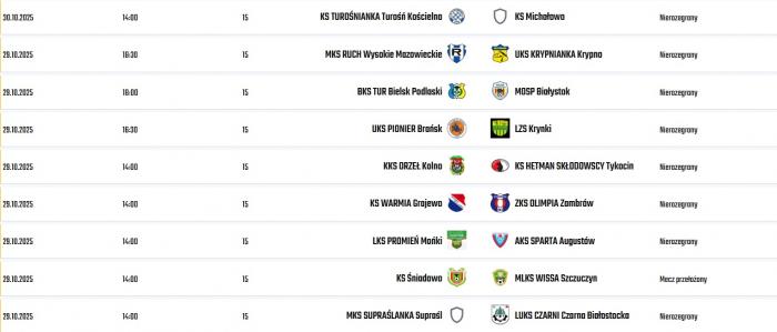 W środę Hetman czeka wyjazd do Kolno (29 października, 14.00), a Pionier tego samego dnia o 16.30 podejmie LZS Krynki (mecz odbędzie się w Czartejewie).