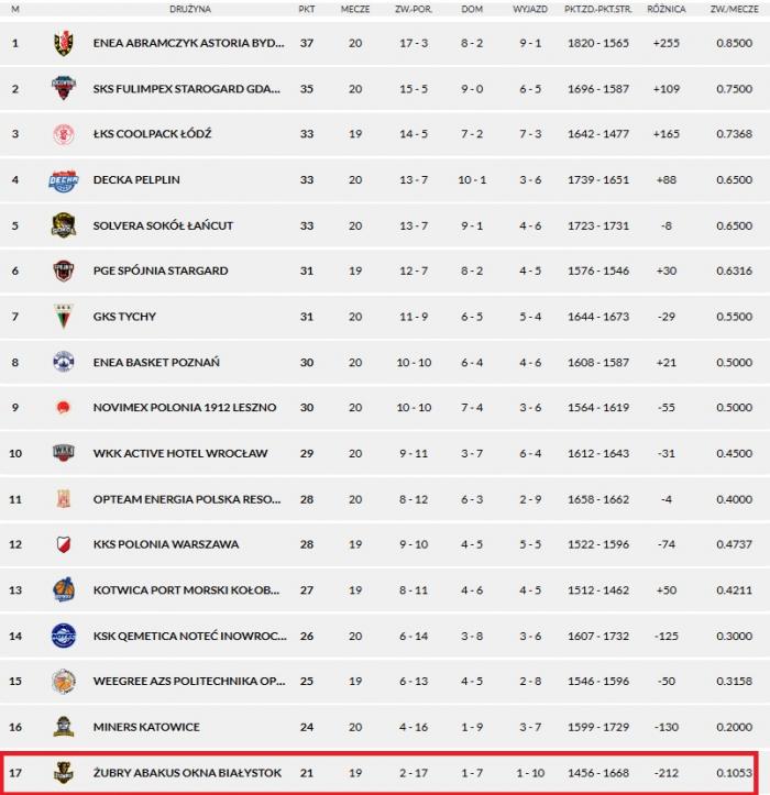 Do ekipy wraca Beniamin Didier-Urbaniak, który ostatnie kilka tygodni leczył kontuzje. Zawodnik potrafi powalczyć skutecznie pod koszem i - kiedy ma swój dzień - trafia za 3 niemal z każdej pozycji. Jego "trójki" - przy dobrej skuteczności Mylesa Douglasa, Samajae Haynes-Jonesa i Witalija Kowalenki - mogą być na wagę wygranej. Wygrana 81:80 pokazuje, że zespół potrafi wygrywać nawet w osłabieniu "stylowe" końcówki, a to w walce o utrzymanie bywa ważniejsze niż wysokie zwycięstwa. Teoretycznie zatem powinno być już wyłącznie łatwiej. Tyle, że zajmując ostatnie miejsce Żubry w każdym meczu będą grali jako outsiderzy. A już we środę (4 lutego) o godzinie 19.00 Żubry Abakus Okna Białystok wracają do własnej hali, by potwierdzić, że triumf w Inowrocławiu nie był jednorazowym zrywem. Kibice liczą na to, że "podwójna mobilizacja", o której mówili rywale, zostanie przekuta w serię zwycięstw. Tym razem rywalem jest WKK Wrocław i tutaj wygrana również jest obowiązkowa. Ewentualna wygrana może przesunąć białostoczan na pozycję, z której w następnych kolejkach mogą pokusić się o opuszczenie ostatniej lokaty w tabeli. Muszą jedynie - bagatela - wygrać z rywalem z Dolnego Śląska i spodziewać się, że Miners Katowice nie upora się u siebie z zespołem z Leszna, a AZS Politechnika Opolska nie ogra PGE Spójni Stargard. Takie wyniki nie byłyby żadną niespodzianką.