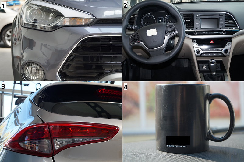 Na powyższym obrazku znajdują się trzy zdjęcia fragmentów aut (czwarte to jedna z nagród) - są to różne modele, ale tej samej marki. Należy zgadnąć, o jaką markę chodzi, a następnie przypisać nazwę modelu do konkretnych fotografii.