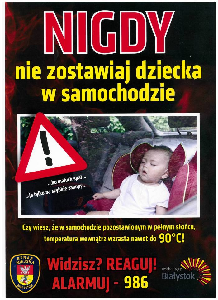 Należy pamiętać, że temperatura we wnętrzu auta potrafi wzrosnąć o 20 stopni Celsjusza w ciągu 10 minut. A pozostawiony na słońcu samochód nagrzewa się nawet do temp. 90 stopni. Wystarczy zaledwie kilkanaście a nawet kilka minut, aby organizm dziecka przestał prawidłowo funkcjonować.