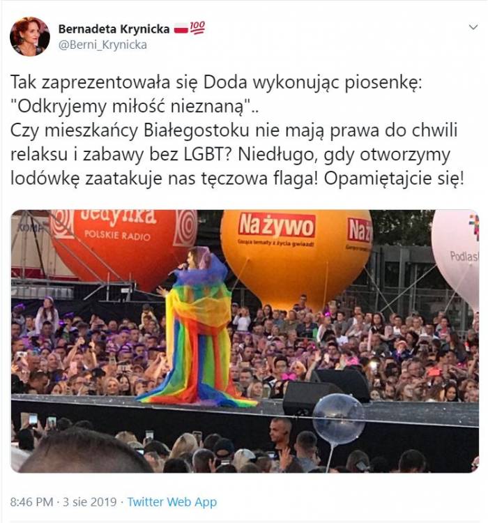 „Tak zaprezentowała się Doda wykonując piosenkę: "Odkryjemy miłość nieznaną".. Czy mieszkańcy Białegostoku nie mają prawa do chwili relaksu i zabawy bez LGBT? Niedługo, gdy otworzymy lodówkę zaatakuje nas tęczowa flaga! Opamiętajcie się!” – skomentowała na swoim profilu na twitterze posłanka Bernadeta Krynicka, która oglądała występ na żywo na kampusie Politechniki Białostockiej.