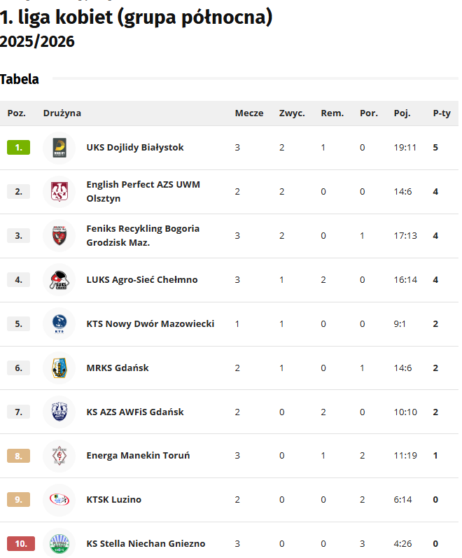 Kobieca drużyna Dojlid Białystok z przytupem weszła na pozycję lidera I ligi grupy północnej. W 3. kolejce białostoczanki w przekonywującym stylu rozgromiły zespół KTSK Luzino wynikiem 8:2. To drugie zwycięstwo w sezonie, które w połączeniu z wygraną nad Energą Manekin Toruń i remisem w Gdańsku, dało Dojlidom szczyt tabeli.