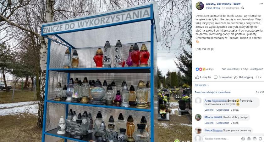 „Uwielbiam jadłodzielnie, banki czasu, wymienialnie książek i nie tylko. Nie cierpię marnotrawstwa. Więc i taką inicjatywę uważam za potrzebną i pożyteczną. Znicze do wykorzystania dla tych, których np. nie stać na zakup i punkt ze sprzętami do wypożyczenia za darmo. Recykling dobry dla portfela i planety. Cmentarzu komunalny w Tczewie- robisz to dobrze!” – napisał administrator fanpage Ciasny, ale własny Tczew.