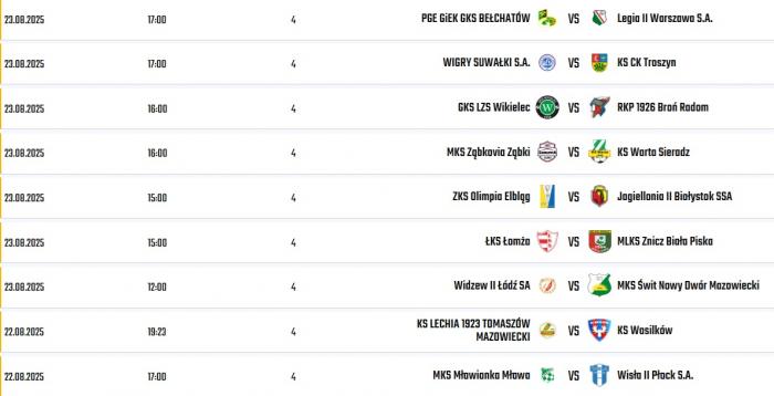 Rezerwy Jagiellonii Białystok czekają trudne zmagania na wyjeździe. Ich rywalem będzie spadkowicz z II ligi, Olimpia Elbląg. Obie drużyny mają na swoim koncie po cztery punkty, co zapowiada wyrównany i zacięty pojedynek. Jagiellonia II będzie musiała pokazać swój potencjał, aby wywieźć z Elbląga choćby jeden punkt. Zwycięstwo mogłoby znacząco poprawić morale drużyny po ostatniej porażce.
