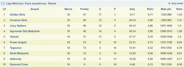 Faza zasadnicza należała do zespołu Golden Girls, który przystępował do finałów w roli głównego faworyta. Sport bywa jednak nieprzewidywalny. W pierwszym półfinale doszło do sensacji – Juicy Spikers rozbiły obrończynie tytułu 2:0, wygrywając drugi set do 9. W drugim półfinale Coralove Girls po tie-breaku pokonały Agrosolar Orły Białystok.