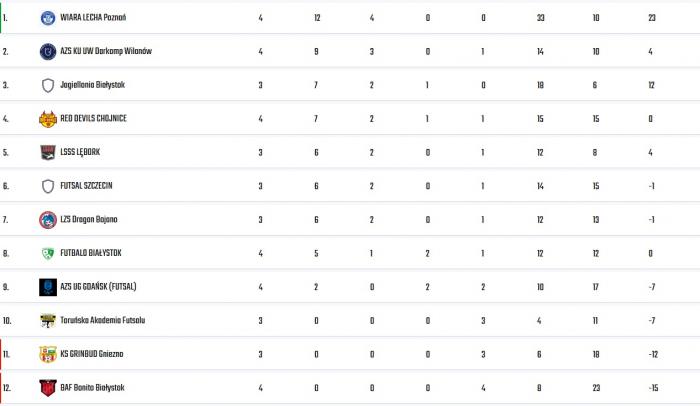 Pozostałe wyniki 4. kolejki: Red Devils Chojnice - AZS UG Gdańsk 2:2, LZS Dragon Bojano - Wiara Lecha Poznań 3:9, KS Gniezno - LSSS Lębork 1:4, TAF Toruń - AZS UW Wilanów 1:4.