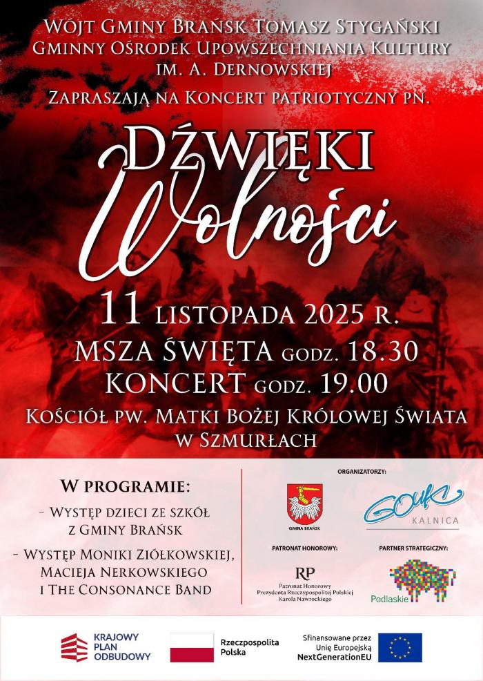 Gmina Brańsk zaprasza na wyjątkowe obchody Narodowego Święta Niepodległości. Wójt Tomasz Stygański oraz Dyrektor Gminnego Ośrodka Upowszechniania Kultury im. Anny Dernowskiej w Kalnicy zapraszają na uroczysty koncert patriotyczny "Dźwięki Wolności". Wydarzenie odbędzie się 11 listopada w Kościele pw. Matki Bożej Królowej Świata w Szmurłach.
