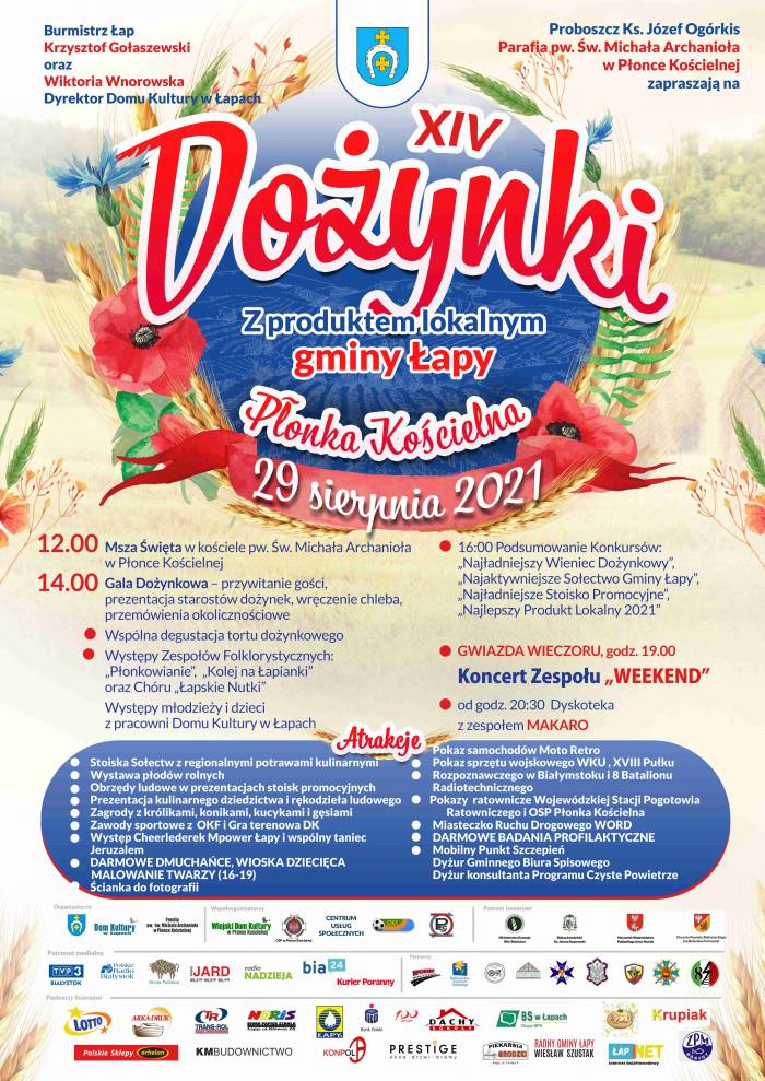 Burmistrz Łap - Krzysztof Gołaszewski, Dyrektor Domu Kultury w Łapach – Wiktoria Wnorowska oraz Ks. Józef Ogórkis – Proboszcz Parafii pw. Św. Michała Archanioła serdecznie zapraszają na „XIV Dożynki z produktem lokalnym Gminy Łapy”. Impreza plenerowa rozpocznie się mszą św. o godz. 12.00 w niedzielę – 29 sierpnia 2021r., w kościele pw. Św. Michała Archanioła w Płonce Kościelnej.