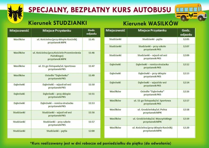 Ograniczone zostały między innymi kursy na trasie Białystok – Studzianki, z wyjątkiem kursów o godz. 9.45 i 20.50. Dlatego, z uwagi na potrzeby mieszkańców Studzianek i Dąbrówek burmistrz Wasilkowa Adrian Łuckiewicz podjął decyzję o uruchomieniu specjalnego autobusu na trasie: Studzianki – Dąbrówki – Wasilków.