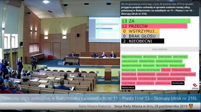 Końcówka posiedzenia Rady Miasta była bardzo gorąca. Oczywiście punktem, który wzbudził tyle emocji było głosowanie w sprawie zmiany nazwy ulicy na osiedlu Skorupy. Radni Platformy Obywatelskiej i Forum Mniejszości Podlasia zdecydowali, że major Zygmunt Szendzielarz pseudonim Łupaszka przestanie być patronem ulicy. Ulica będzie od teraz nosiła nazwę „Podlaska”.