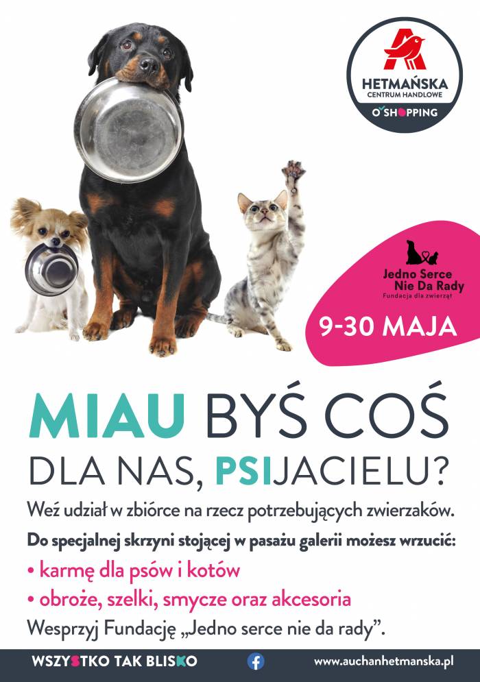 Ostatnie tygodnie to czas trudny również dla zwierząt, które nie mają domów i troskliwej opieki. Od 9 do 30 maja Centrum Handlowe Auchan Hetmańska organizuje zbiórkę karmy dla psów i kotów oraz obroży, szelek i smyczy. Dary trafią do podopiecznych Fundacji „Jedno serce nie da rady” pomagającej potrzebującym zwierzętom na Podlasiu.