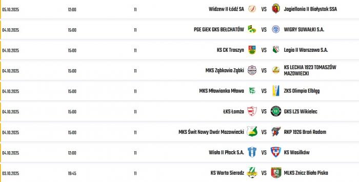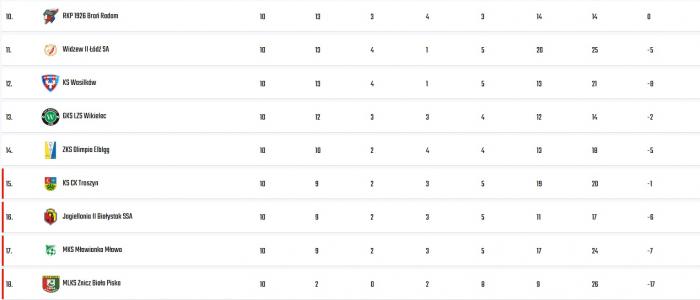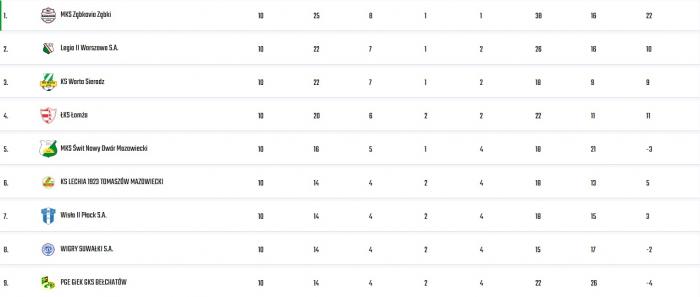 Pozostałe wyniki 10. kolejki: Ząbkovia Ząbki - Świt Nowy Dwór Mazowiecki 5:1, Warta Sieradz - PGE GiEK GKS Bełchatów 2:1, Znicz Biała Piska - Mławianka Mława 1:3, Olimpia Elbląg - KS CK Troszyn 1:1, GKS LZS Wikielec - Wisła II Płock 1:2.
