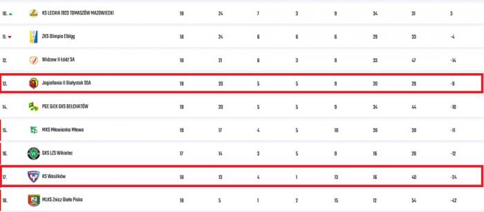 Sytuacja beniaminka z Wasilkowa jest - mówiąc wprost - dramatyczna. 17. miejsce w tabeli i seria 10 porażek z rzędu to bagaż, z którym trudno wchodzić w nową rundę. Do bezpiecznego miejsca brakuje 5 punktów, ale szacuje się, że do utrzymania potrzeba łącznie około 40 „oczek”. To oznacza, że niebiesko-czerwoni muszą zdobyć 27 punktów w 16 meczach (średnia 1,68 na mecz).