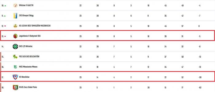 Nad KS Wasilków gromadzą się czarne chmury. Choć walka o utrzymanie wciąż trwa, to środowa porażka na własnym boisku w zaległym meczu sprawiły, że kibice beniaminka coraz częściej zerkają w stronę IV ligi. Zaległe starcie 19. kolejki z GKS-em Wikielec miało być przełomem i ucieczką ze strefy spadkowej, a stało się bolesną lekcją futbolowej bezwzględności. W 24 kolejce Wasilków gra o życie w Mławie. Ważne mecze zagrają też ŁKS Łomża i Wigry Suwałki. Tylko ta ostatnia drużyna zagra u siebie.