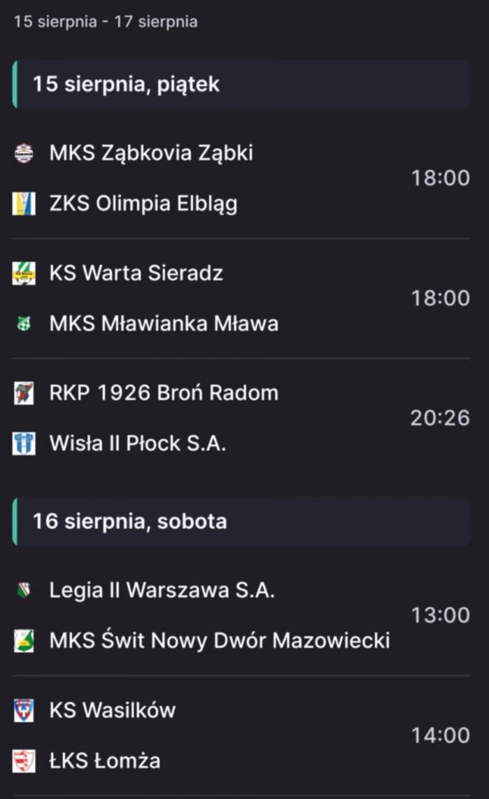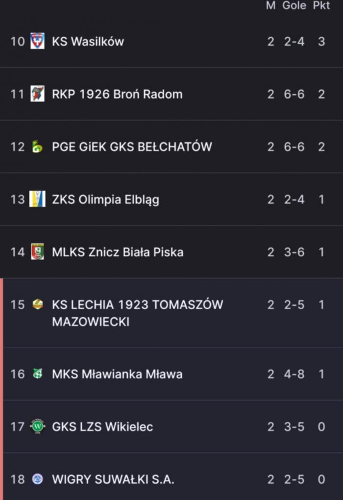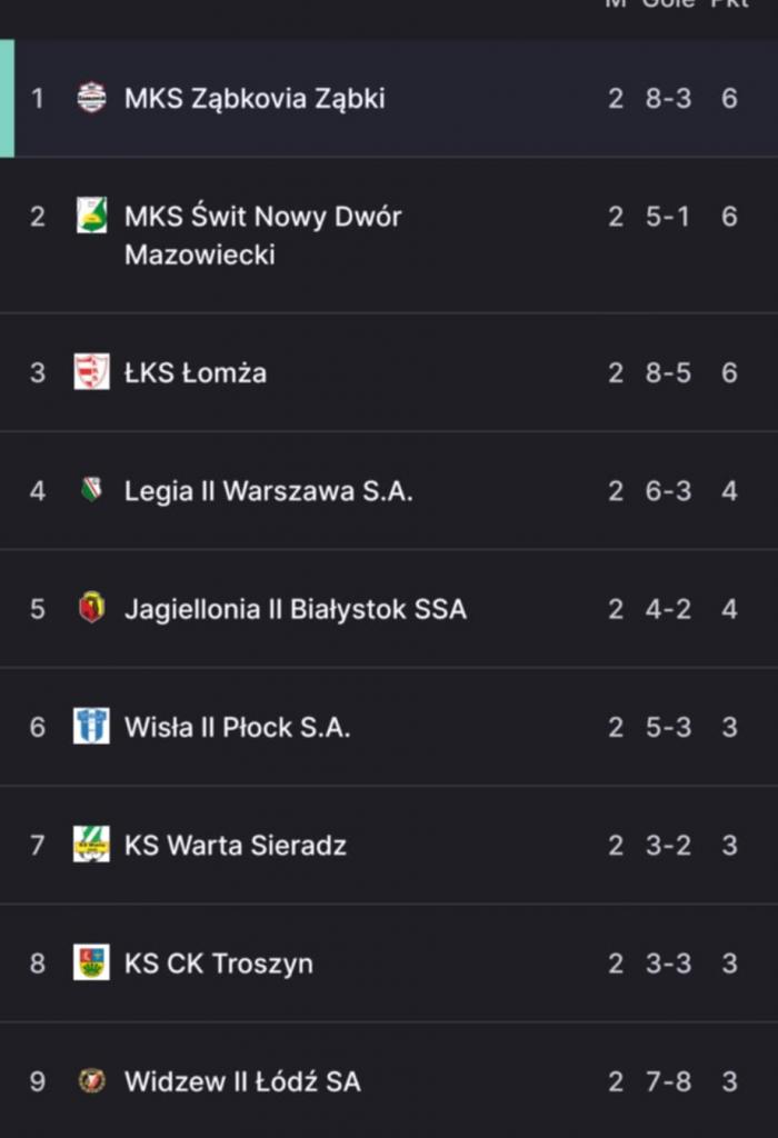 Pozostałe wyniki 2. kolejki: Wisła II Płock - Znicz Biała Piska 4:1, PGE GiEK GKS Bełchatów - RKP 1926 Broń Radom 4:4, Mławianka Mława - Legia II Warszawa 2:2, Olimpia Elbląg - Warta Sieradz 0:2, Świt Nowy Dwór Mazowieckie - KS CK Troszyn 2:1.